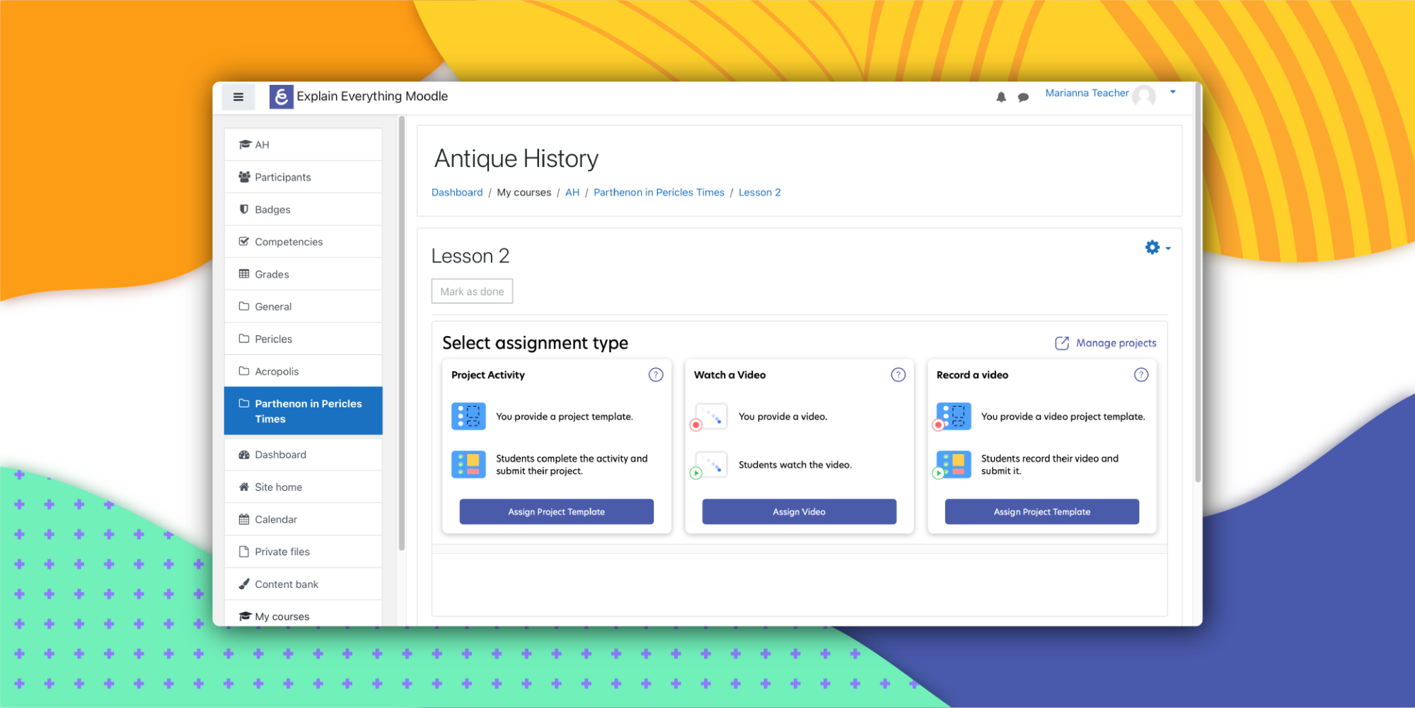 - Project Activity – perfect for lessons, homeworks, tasks or tests. Whenever you create a project in Explain Everything, you can assign it to students using Moodle LMS. They will get a notification about the assignment and will have to submit it to you after they complete it according to your instructions. A copy of your project is automatically created so that each student works on their own individual version. Find out how to create a Project Activity assignment.