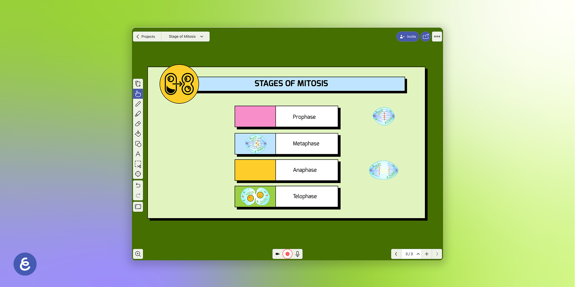 The “Mitosis: Stages” whiteboard template is a ready-made educational tool designed to help students understand and visualize the process of mitosis. This interactive template allows users to sort the stages of mitosis—prophase, metaphase, anaphase, and telophase—into the correct order, enhancing their comprehension of cell division.
