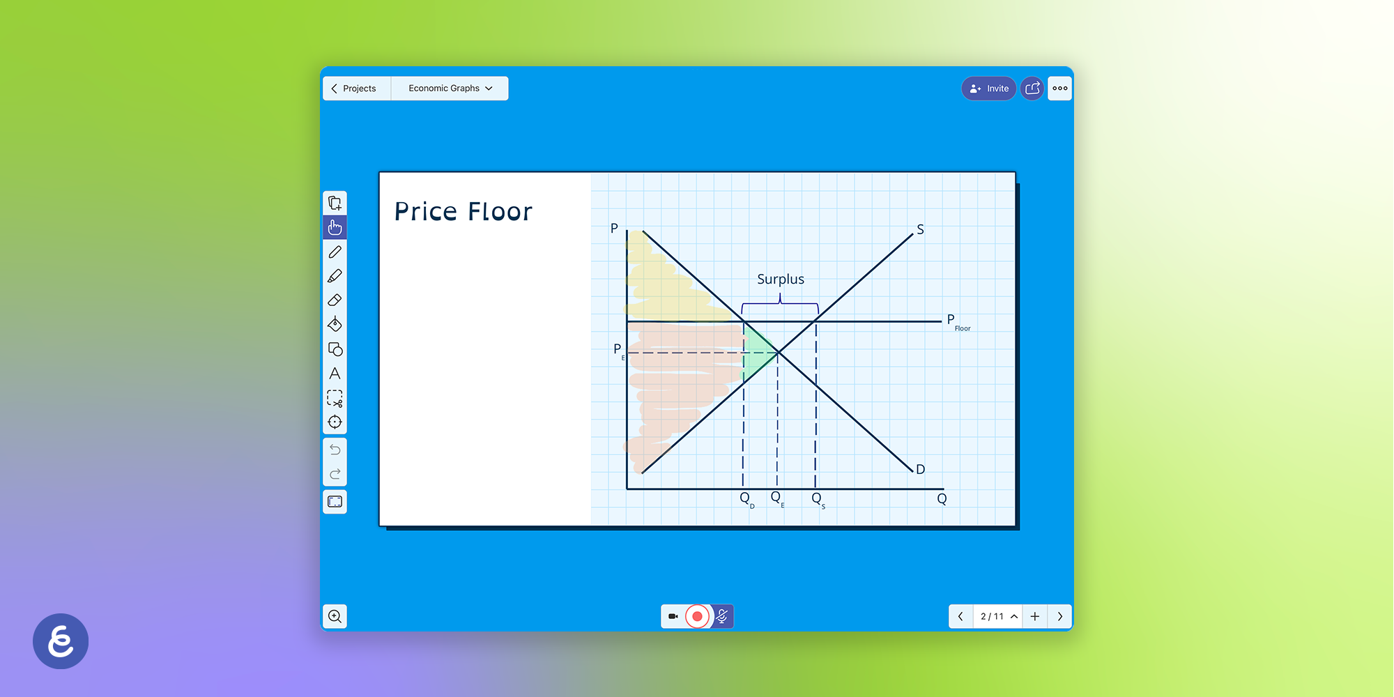 The “Economic Graphs” template is a dynamic educational resource designed to help students understand key economic concepts through visual representation. This template includes graphs that illustrate supply and demand curves, along with the impact of a price floor on the market.