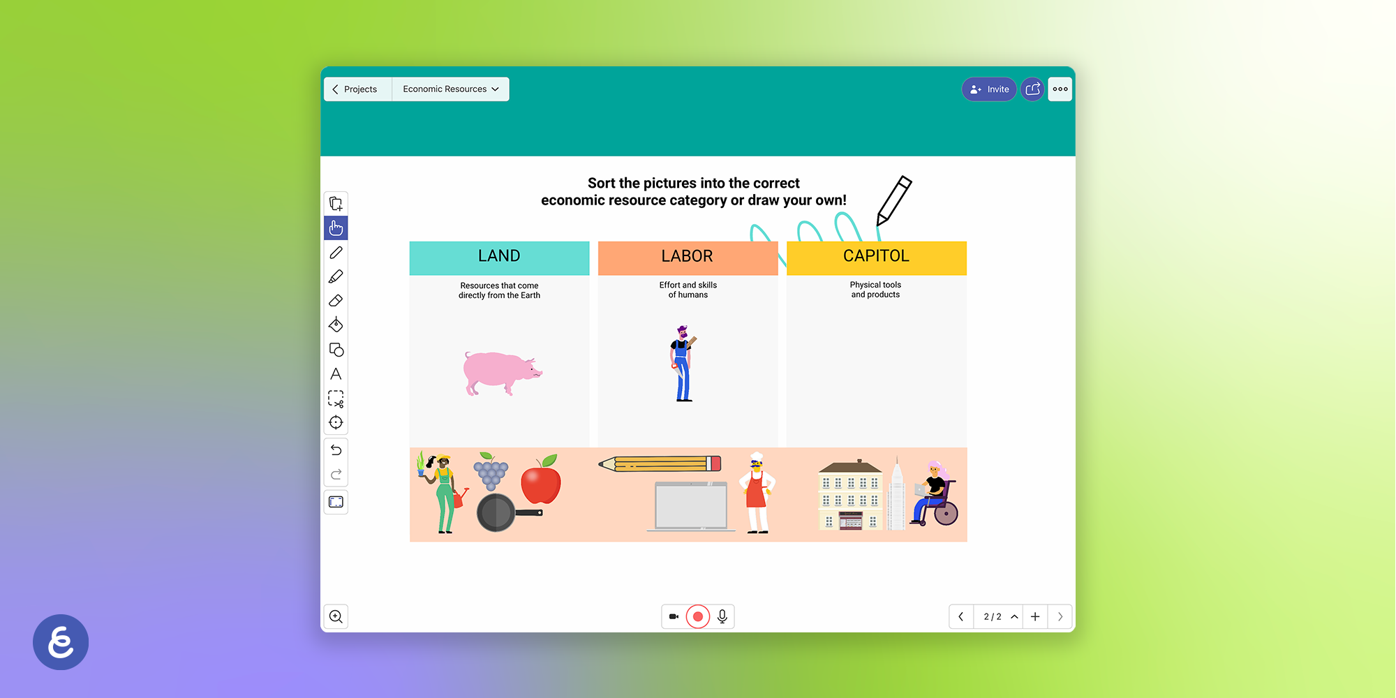 The “Economic Resources” template is an interactive activity designed to help students understand the different categories of economic resources. In this exercise, students sort various pictures of resources into their appropriate categories—natural resources, labor, and capital resources.
